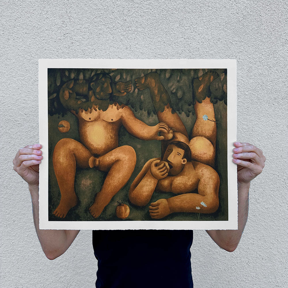 We are delighted to welcome Carlos Rodríguez back into our studio with the production of three new serigraph prints. We pushed the process further than our past collaborations, resulting in editions that are rich in both color and spirit. Joyful figures enjoy luscious fruits, relishing in the company of each other and their animal friends.
