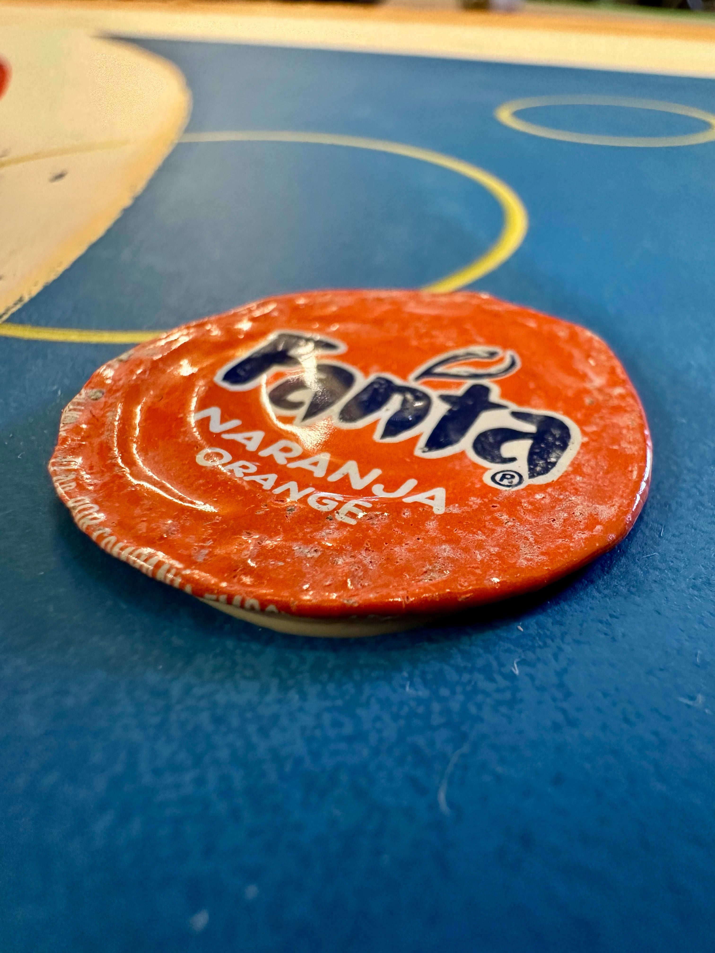Embellished by Carlos Ramirez with paint and found objects (bottlecaps, stickers, etc)
