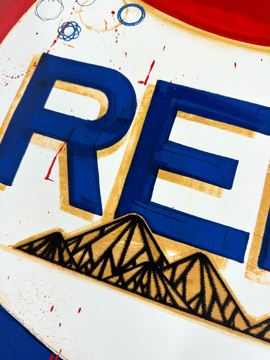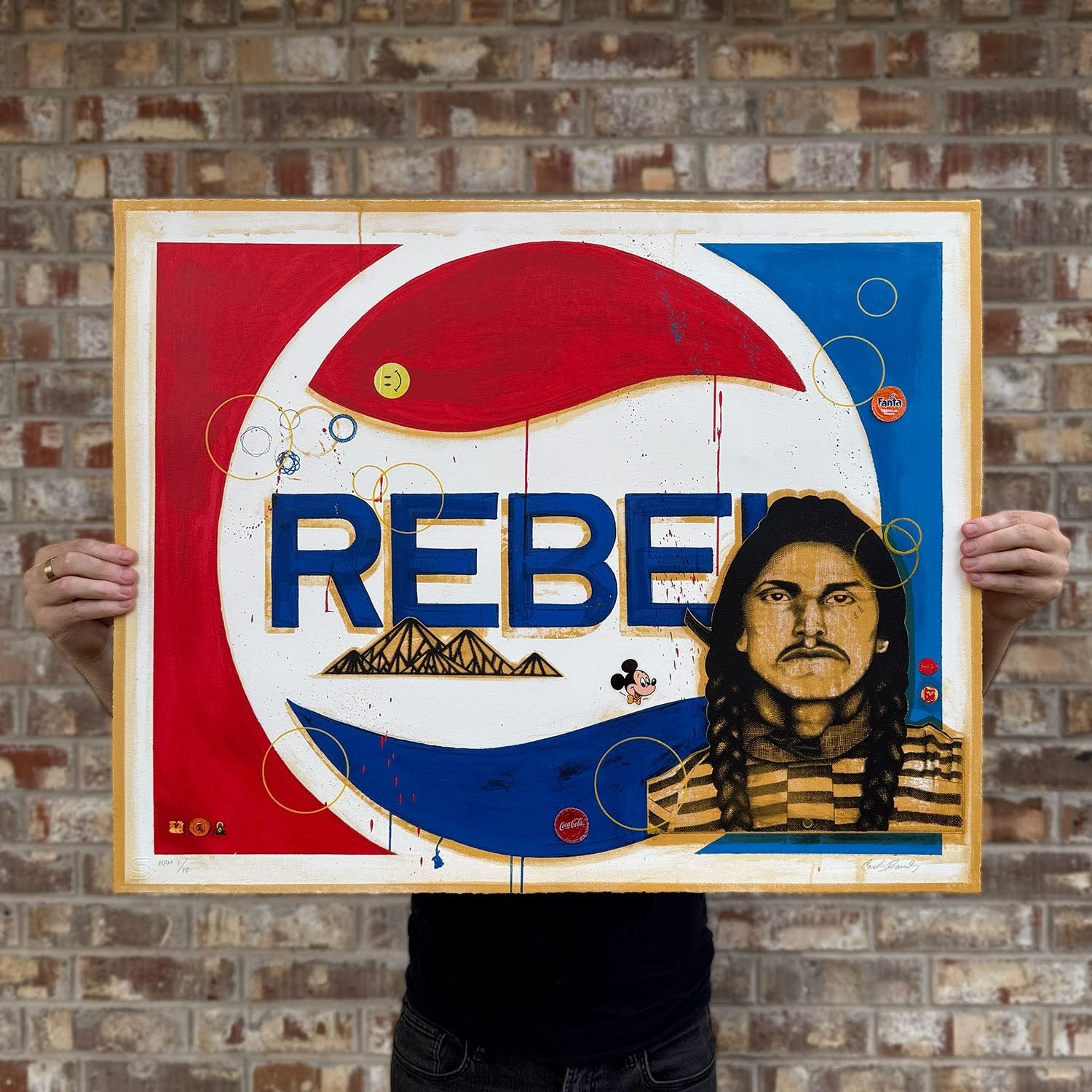 'Rebel' is a conversation, juxtaposition and contrast of past, present, and future, combining popular and iconic culture along with historical imagery that for me personally illustrates, highlights, and questions the trajectory of America as a society. I found this image haunting; a 1901 mugshot of a Native American inmate from the McNiely Island Penitentiary, and decided to use it as a visual testimonial of our past in contrast to current popular branding that has become so ingrained in our minds.